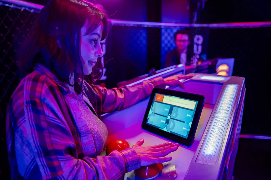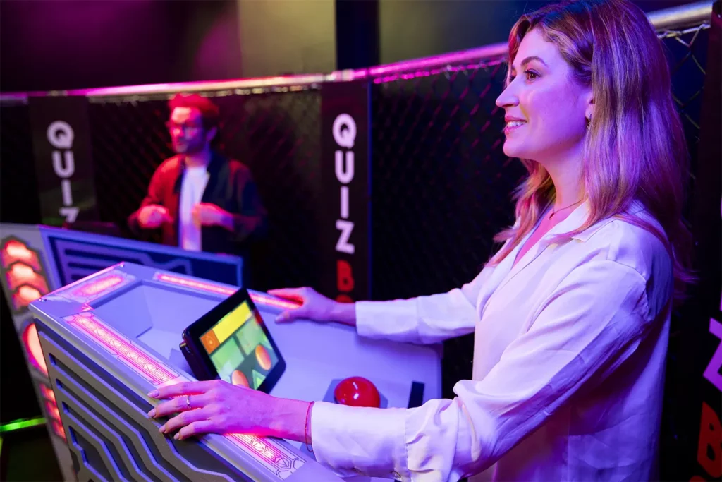 Imaginez-vous en train de vous préparer à entrer dans une Quiz Box avec votre famille, vos amis ou vos collègues de travail : les portes s’ouvrent dans un grand show de lumières, la musique résonne dans l’arène. Chacun se met en place derrière sa borne de jeu et se prépare à enchainer plusieurs rounds, riches en tensions et en rires.